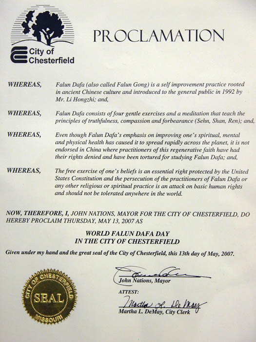 鉴此,我,约翰•内森,密苏里州切斯特菲尔市(Chesterfield)市长,特此宣布二零零七年五月十三日为切斯特菲尔市的