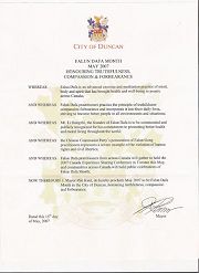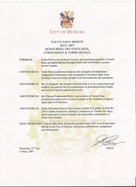 鉴此,我,邓肯市市长菲尔•肯(Phil Kent),特此褒奖二零零七年五月份为邓肯市“颂扬真、善、忍的法轮大法月”。