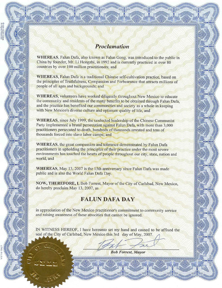 鉴于,新墨西哥的自愿者们努力的将修炼法轮大法的益处告诉社区居民,为了保持新墨西哥的多元文化和最佳的生活质量,我们的社区和社会已经受益于法轮大法;并且