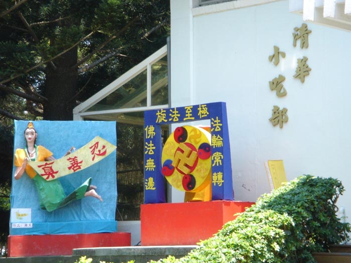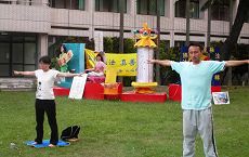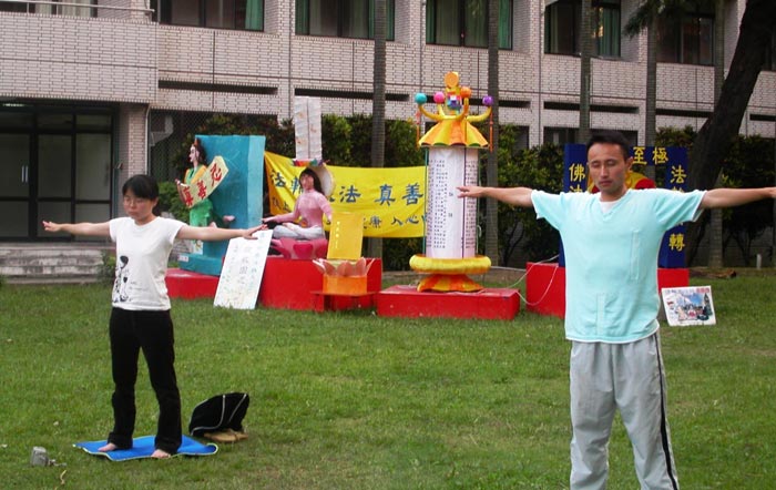 伴随着花灯展的展出,竹教大的活动主办同学们决定在早、晚六点十分,在花灯展现场进行义务教功活动,希望让对法轮功有兴趣的老师、同学与附近民众有机会可以学炼。随着炼功音乐的响起,许多老师、同学们的眼光都投向了在草坪上炼功的人,不时会听到同学们说:「喔!他们在炼功呢!」