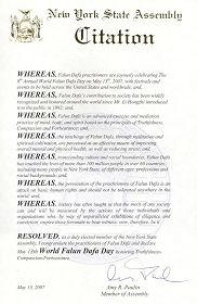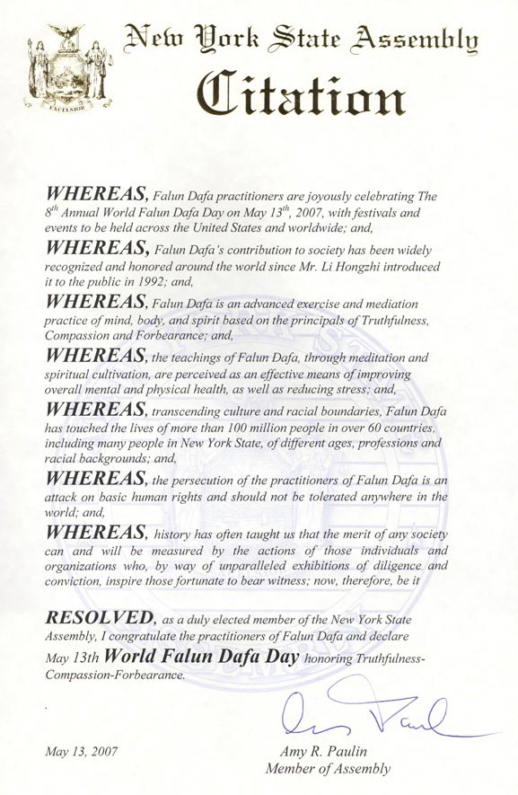 经决定,我,作为一名公正选出的纽约州议员,祝贺法轮大法学员,并宣布二零零七年五月十三日为世界法轮大法日,以褒奖真、善、忍。