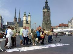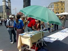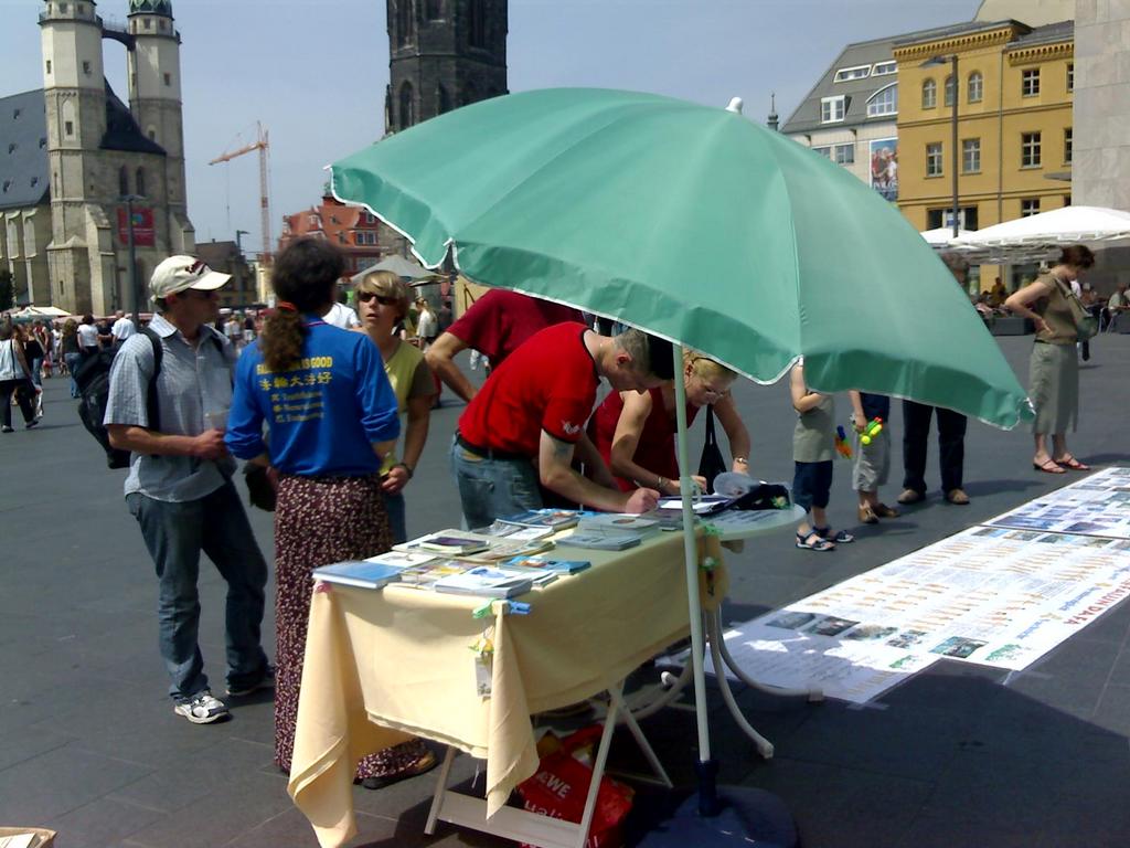当法轮功学员在中国被迫害,甚至被活体摘取器官的展板刚刚摆出,好奇的哈勒民众就都围拢了过来。大家仔细的阅读,迫切的询问,认真的聆听。学员为一位民众仔细讲解真相的时候,很多人就里三层外三层的围着听,之后还自动分成小组就这话题互相讨论。看着这些具有日耳曼民族纯朴、善良、严谨特性的德国人认真讨论的态度,在场的学员深受感动。