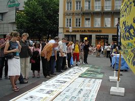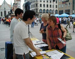 周末的慕尼黑玛琳广场一如既往,挤满了前来购物观光的人群。当希望.之声播放的《·九·评*共产党》和《大.纪.元;郑重声明》回荡在广场上空,虽说大部份人听不懂中文,但人们还是被吸引到展台前,仔细观看揭露中共通过历次运动迫害中国民众的图片展板。特别是听到法轮功学员用德文介绍了关于中共活体摘取法轮功学员器官一事,不少德国民众带着震惊、悲愤和不可置信的表情到信息台前,签名谴责中共迫害法轮功的暴行,并呼吁营救德国法轮功学员张震彤的妻子王晓艳(王晓艳因炼法轮功而被中共非法关进劳教所)。