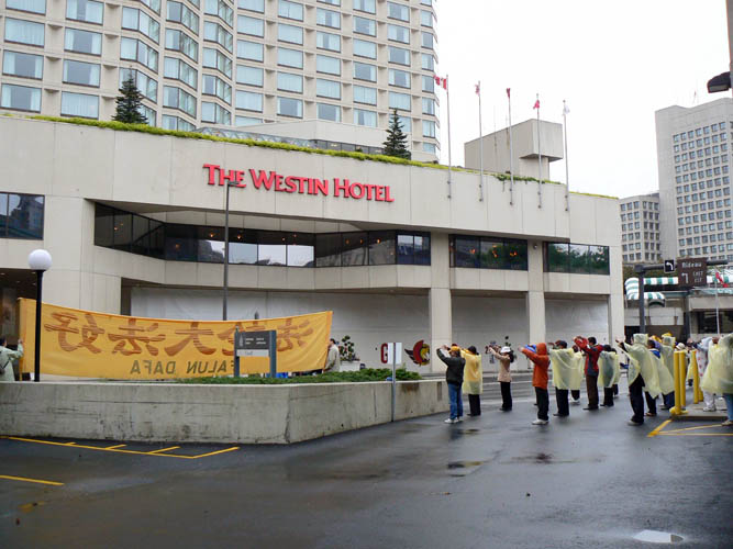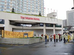 ![]() 法轮功学员冒雨在薄熙来下榻的维斯汀(Westin Hotel)旅馆外抗议薄的罪行 |