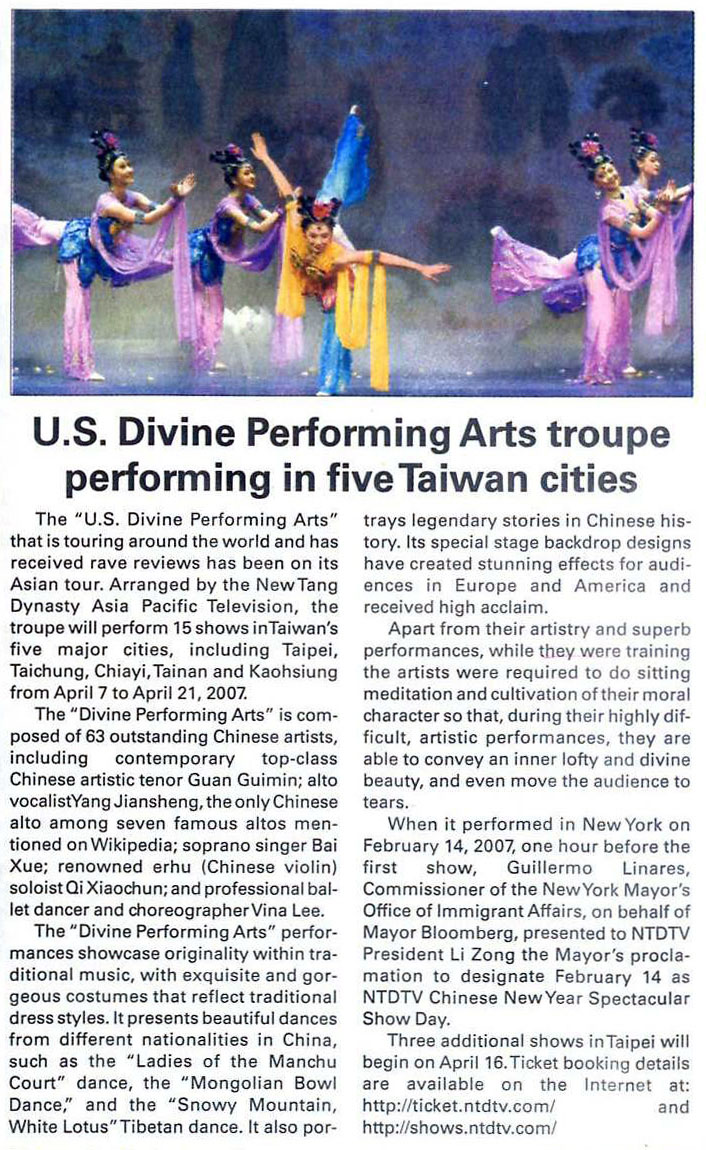 二月十四日,在神韵艺术团纽约首场演出前一小时,纽约市长办公室移民事务局局长格维勒默•李纳尔斯(Guillermo Linares)代表市长彭博向新!唐!人:总裁李琮颁发褒奖,将二零零七年二月十四日定为“新!唐!人:华人新年晚会日”。