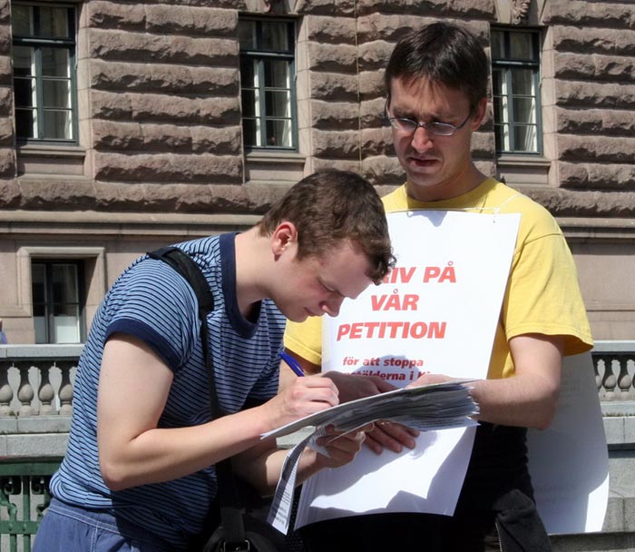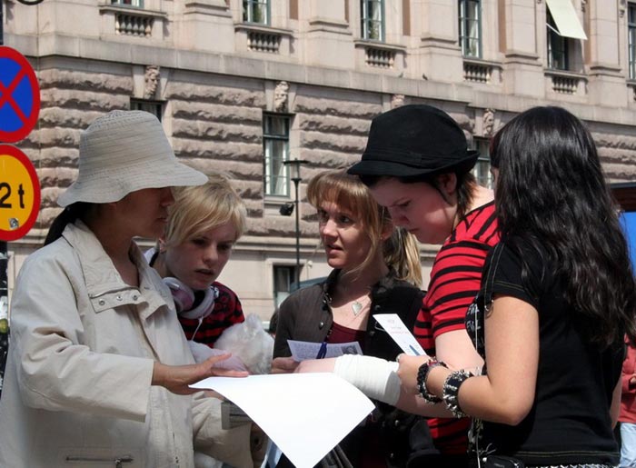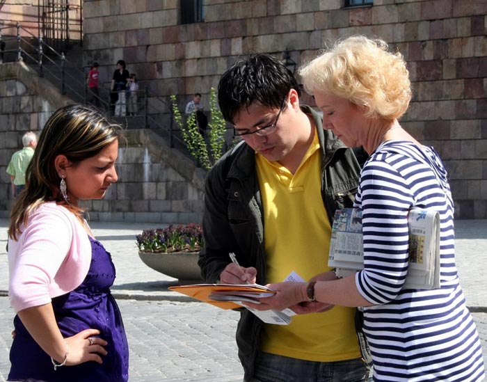 人群中有一家五口瑞典人,是斯德哥尔摩当地的居民,他们接过传单紧锁眉头,连连的摇着头说,太恐怖啦!一定要制止它们(中共的迫害)!一家人工工整整的在签名簿上按着顺序各自签上了自己的名字。接着他们开始询问关于法轮功的更多的信息,当他们得到有关法轮功的更多的资料以及斯德哥尔摩炼功点详细的地址和炼功时间时,非常的高兴。