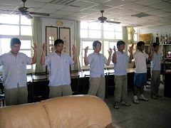 午餐之后,三人依约到我的办公室来,且肃然的于沙发椅上坐定。但是当三人一看到我手上的《转法轮》经籍时,互相交换了个眼神后,都不经意的笑出声来。此刻我想起了《转法轮》经文上的一段法理:“炼功人必须得忍。有人管孩子也发火,简直吵翻了天,你管孩子也用不着那样,你自己不要真正动气,你要理智一些教育孩子”。寻思至此,我也报以微笑,并且邀请三位以结印的端正坐姿,闭着眼睛聆听我读法。