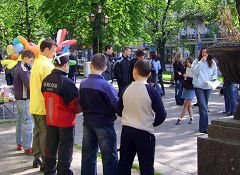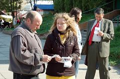 此外,还有一件有趣的事情。一位法轮功学员在去利沃夫的路上,在火车上遇到了一位修炼好多年,但是由于交通通讯不便很少能见到面的同修,于是大家高兴的交流起来。正在这两位学员交流的高兴时,旁边一位六十多岁的老者突然说道:“我能不能打断一下你们的谈话呀?我有一个问题想问一下。”学员说:“当然可以了,请讲。”“你们谈的法轮大法是不是这张传单上写的?”老者从口袋里拿出来一张传单,正好是介绍法轮大法的传单。学员回答:“是呀!”这位老者又说道:“请问,你们的大法现在洪传了多少个国家,你们经常举行活动吗?”“我们的大法现在弘扬八十多个国家,我们在世界各地都经常举行活动的,让更多的人知道他,并走入大法中来。”老人高兴的说:“那就是他了。”他又接着说到:“我爷爷以前告诉过我,将来会在中国那个地方出来一股力量,来拯救全世界,拯救人类,他们会在不同的国家举行活动。”说到这里,车正好停在了这位老人该下车的站,他不得不离开,临走时,他高兴的说:“再见!祝你们幸福。”