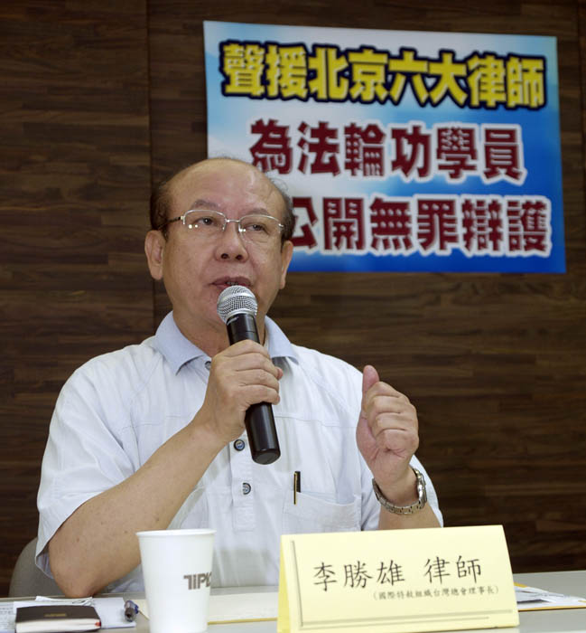 李胜雄说,他与黄默教授已上了中共的黑名单,不能再进入中国大陆。中共为了经济发展,忽略人民的基本人权。而宗教自由与信仰自由是非常可贵的,是一个精神上的资粮,是无可取代的。我虽是基督徒,可法轮功是直接被(中共)迫害的最大团体,在中共的残暴政权下为法轮功伸张正义,我对北京六名律师致以高度敬意。不仅是这六位律师能站出来,应该所有的中国律师都来为制止这人权迫害而奋斗。