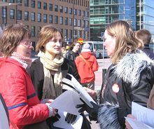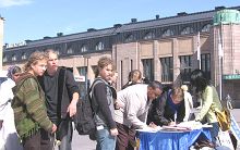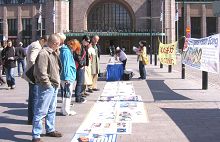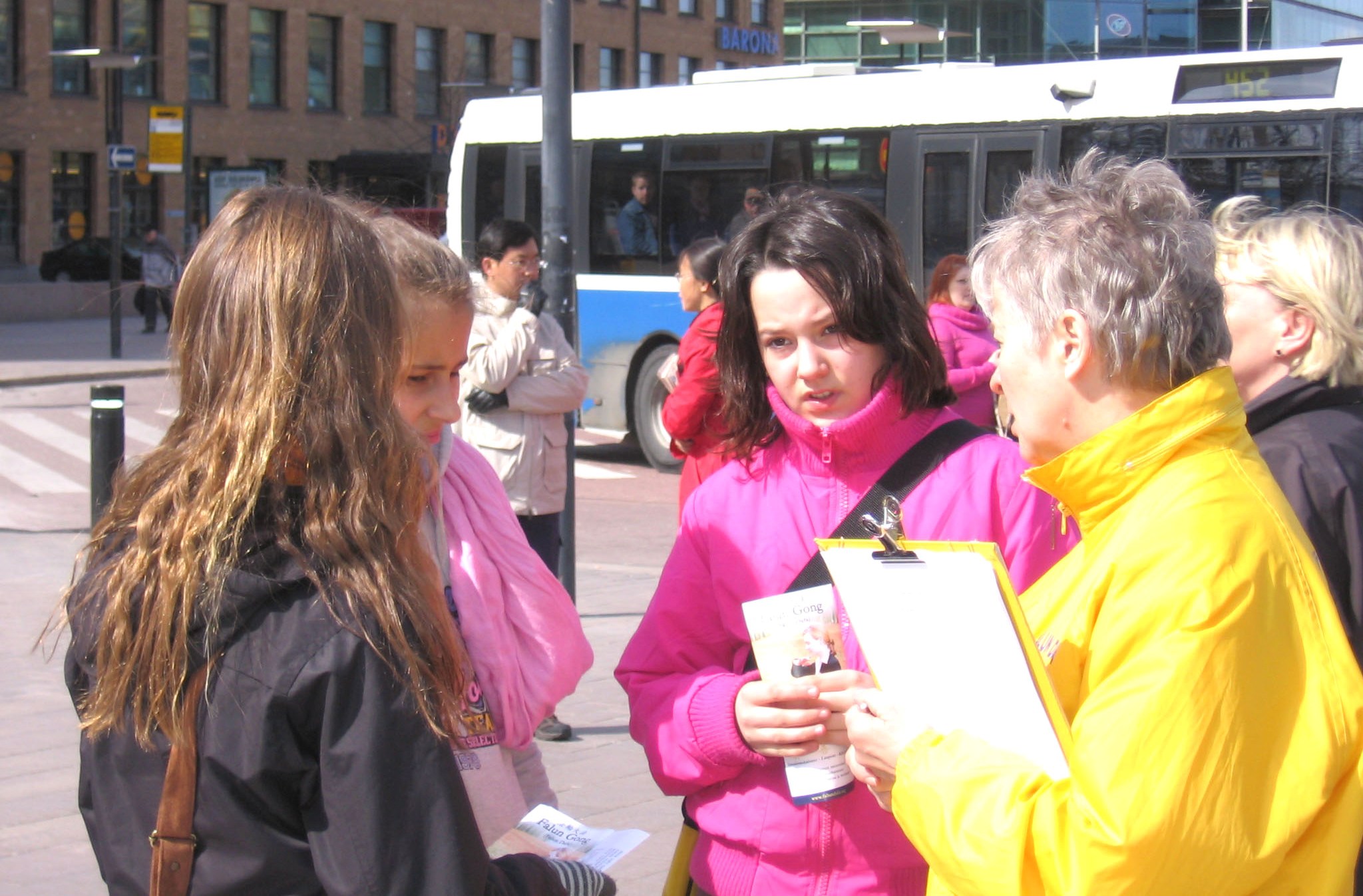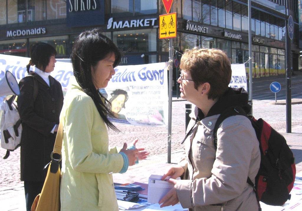 二零零七年五月五日,芬兰部份法轮功学员周末又一次来到赫尔辛基火车站旁,向人们讲述中共恶党对法轮功学员的残酷迫害,并呼吁芬兰政府和民众帮助营救一个月前在中国武汉市被中共“六一零”办公室绑架的法轮功学员张伟杰。中国留学生Sunny向人们讲着父亲张伟杰目前仍没有确切消息,妈妈奔走呼号但还没见到父亲,更令她们母女担心的是中共活摘法轮功学员器官来牟取暴利的行径每时每刻都威胁着张伟杰的生命。在Sunny拿着一封内装有写给芬兰政府和政要的求助信,呼吁芬兰政府和民众伸出援手时,她不断的听到人们关心的对她说着上述的话。Sunny说:在这里我不感到孤独,这么多善良的芬兰人民和我们站在一起,中共的迫害不会延续多久了,等待它的是彻底的灭亡。