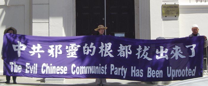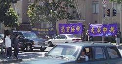 ![]() 旧金山湾区法轮功学员在中领馆打出横幅,敬告中领馆职员退!党!保命。 |