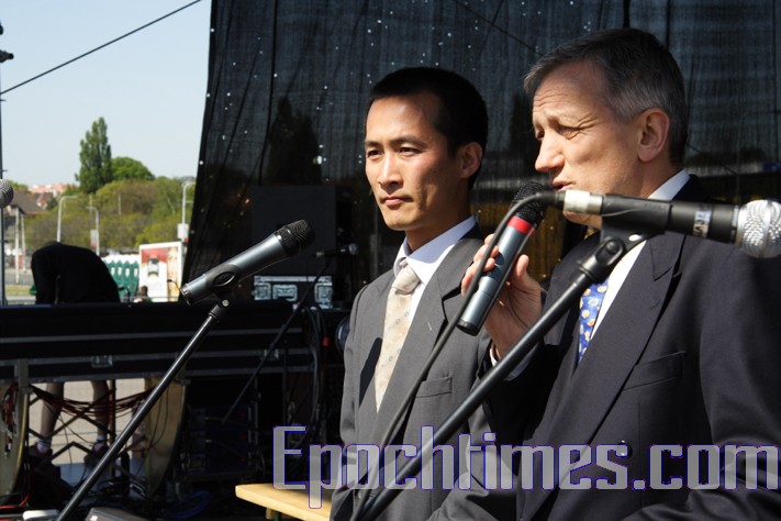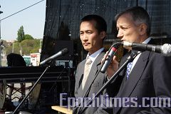 ![]() 来自爱尔兰的赵明(左)在集会上讲述了他因修炼法轮功而在中国的劳教所受到酷刑折磨的经历。 |