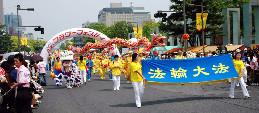 【明慧网二零零七年五月九日】二零零七年广岛鲜花节于五月三日在日本广岛召开,这是日本五月连休中的三大庆典活动之一,每年大约有一百五十万人参加,今年的主题是“联接广岛与世界的鲜花节”,除当地团体外,还有印尼、泰国和韩国等外国团体参加。法轮功团体已经是连续第五年参加市民大游行。法轮功学员表演了腰鼓、狮子舞、舞龙和仙女花车等,把“真善忍”的福音传递给鲜花节成千上万的观众们。