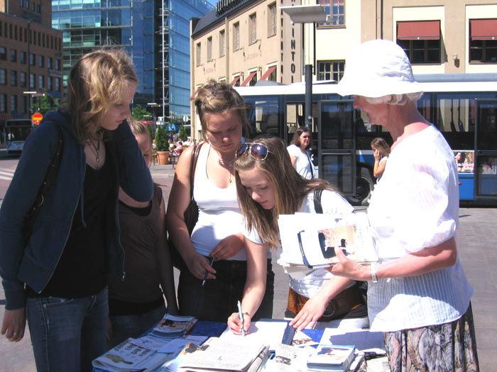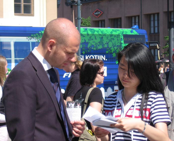 一位先生开始不接资料,学员向他讲真相过程中,他说:这种迫害的事一九一七、一九一八年在芬兰历史上也发生过。学员说:那是俄国人迫害芬兰人。目前在中国却是中国人在迫害中国人。这位先生接着说:共产国家都这样,前苏联就这样。和学员交谈完后,他接了资料,同时还签名反对中共迫害法轮功。