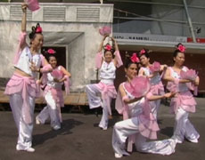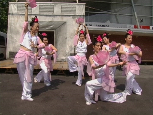 法轮功学员的表演开始了,古筝的音乐响起后,原本嘈杂、混乱的人群突然变的安静而有序,纯洁无瑕的莲花舞一上来更使得在场观众心旷神怡。