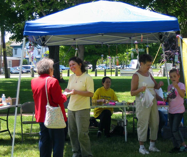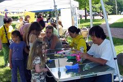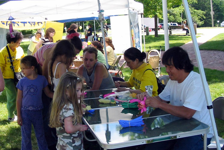 法轮功学员的展位广受游人的欢迎。人们一边了解真相,一边学叠纸莲花。小朋友们更是对之流连忘返,拿着叠好的莲花,爱不释手。有些有缘人离去后,又多次带着亲朋好友返回法轮功摊位,再次结缘。