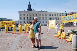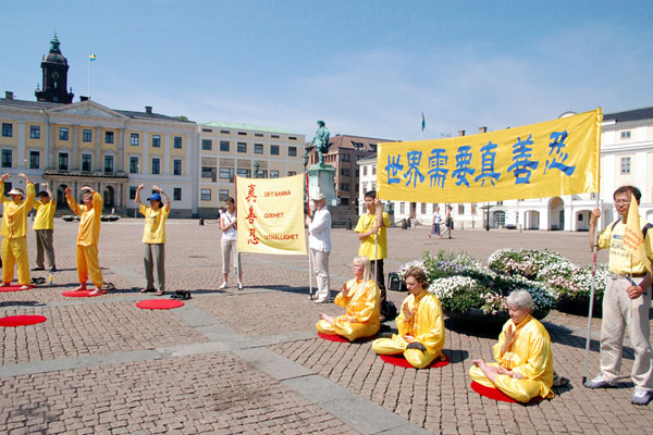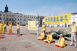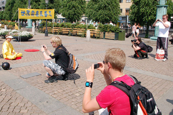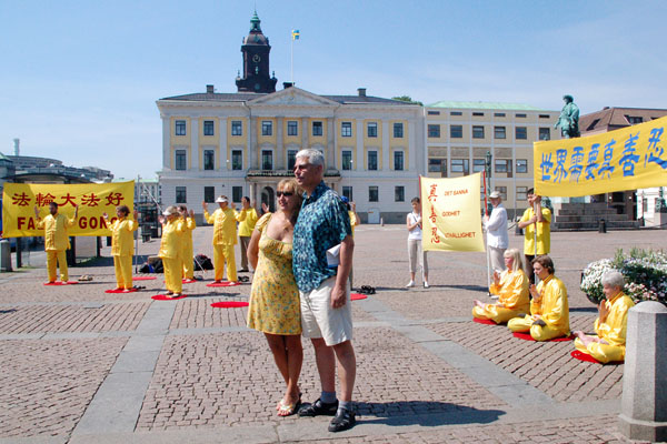 祥和的炼功场一下子吸引了人们的注意力,很多了解了真相的人们特意走上前来表示对法轮功的支持。巴尔布鲁女士(Barbro)在参加“哥德堡号”归来仪式前静静的观看了一阵学员们的功法演示。仪式结束后,她特意跑回来,对法轮功学员说:“你们的祥和表演是对中共罪行最有力的抗议!”
