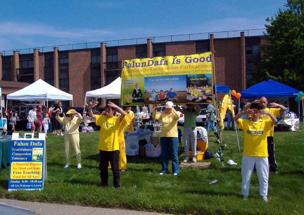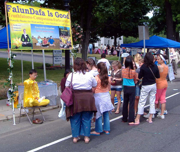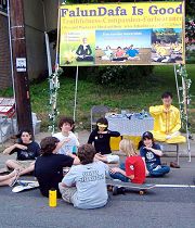 法轮功学员在自己的展位上边挂上了自制的带有“法轮大法好”及炼功图片的横幅,横幅的旁边有一个桌子,上面放着真相资料。学员们有的发正念,有的发资料,有的炼功,有的向居民们讲中共对法轮功长达八年的残酷迫害,甚至活摘法轮功学员器官的暴行等。