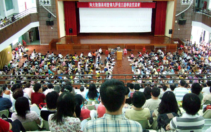 二零零七年六月十日清晨,台湾各地的法轮功学员搭车或自行开车前往南投草屯县立体育馆聚集,他们说,为了要做好向大陆可贵的中国人讲清法轮功真相,以及让大陆民众了解共产党的邪恶,赶快脱离中共邪*党-组织,保平安,因而举办向大陆讲真相暨传《·九·评*》、促三:退.学法交流会。
