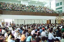 一整天的活动,学员们一早到来寒暄一会儿,随即铺开简易坐垫就坐在地上一整天,底下不够坐了到二楼也坐满了,一千多人的场合没有喧哗吵闹,连小朋友也变的特别安静守秩序;也不管什么年龄层,什么样的身份地位,到这里大家都是一样的待遇。