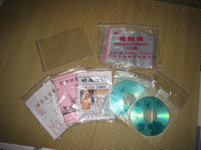 市场上有一种塑料自封袋,封口处有一胶条,非常适合发放真相资料,尤其是真相光盘,各种大小的都有,可根据需要选购。我们一般常用的有光盘和 32 开书本大小。光盘大小的可装入光盘、小册子或折叠好的真相传单(横竖各折一次即可,不会挡住胶条),32 开书本大小的可装入正常书本大小的《·九·评*》。