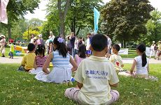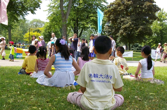 明慧学校的小弟子开始在中央岛的草地上向游客展示法轮功的五套功法。他们炼静功的神态吸引了不少人驻足观看,很多人接过法轮功学员递上的真相资料。