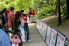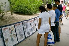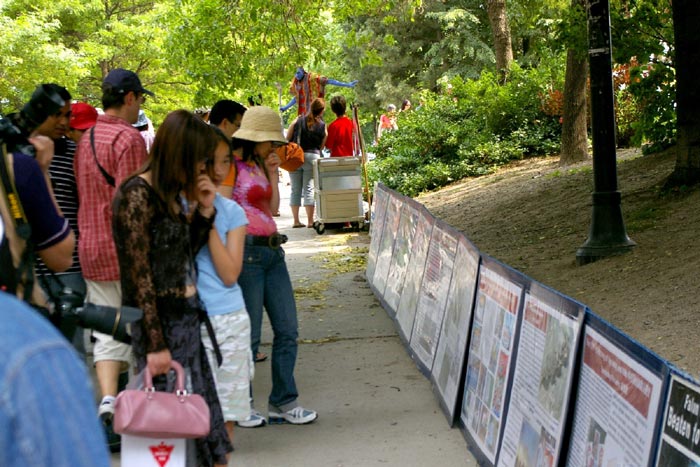 “今天我们的图片展,揭露了中共从文革、六四到一九九九年开始迫害法轮功的残暴历史。很多游客都是目不转睛的看着,都是认真的看完才离开。”王先生说,“一位年轻女士过来对我说,她有个朋友在中国因为修炼法轮功而被抓進了监狱,她说她知道法轮功被迫害的真相。她现场自名‘白云’做了‘三:退.’声明。”