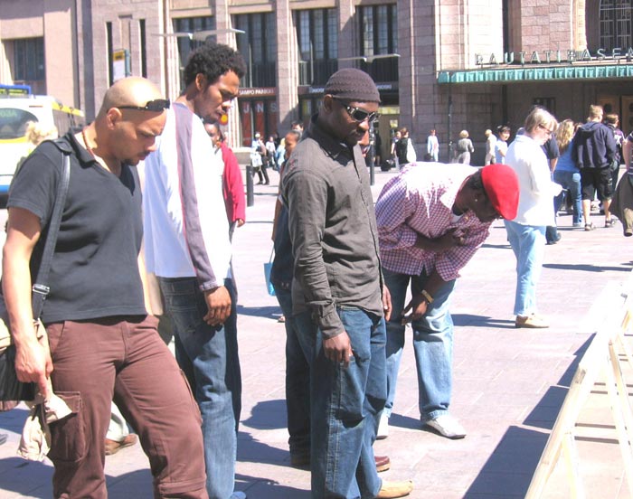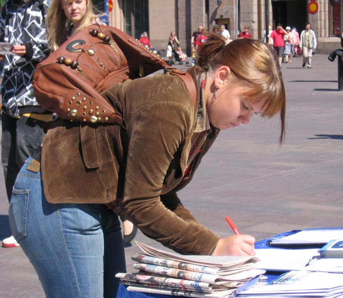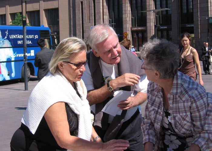 很多芬兰民众看到此信息后,纷纷前来聆听现场学员用芬兰语一遍遍广播着的Sunny父母遭绑架的详情。人们认真阅读图片展板和介绍、接受Sunny和学员递上的请签名并邮寄给芬兰政要的营救信函。好几位芬兰人含着泪对法轮功学员说:“你们做了一件很好的事。”“怎么能制止这场迫害,我们能做些什么?”