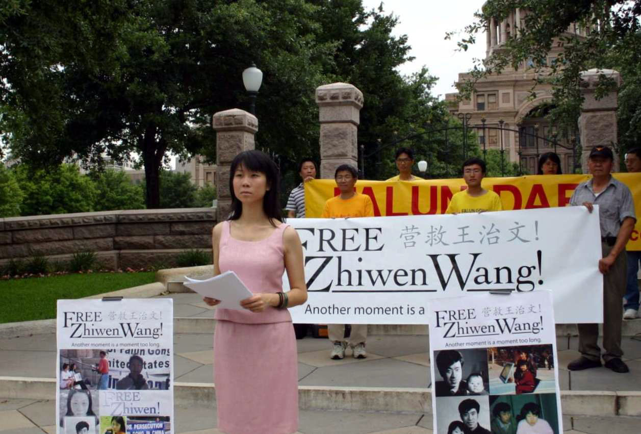 ![]() 王晓丹在德州州政府大楼前呼吁营救因修炼法轮功而被中共非法判刑的父亲王治文 |