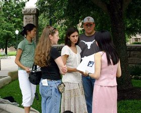 在酷热的六月阳光下,在德州州政府大楼前,晓丹郑重的发出了呼吁:要求中共立即释放她的父亲,请人们伸出援手制止这场迫害。晓丹的很多朋友,特地赶来鼓励。其中也有一些来自于奥斯汀、休斯顿和达拉斯的法轮功学员。过往的行人、观光客当知道了晓丹的故事后,纷纷表示同情,并在征签表上签名表示支持营救她父亲、及制止这场迫害。
