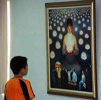 这次画展一共展出四十三幅作品,分为“天上人间,佛光普照”、“同化大法,返本归真”、“传播真相,呼唤正义”、“善恶有报,正义审判”四部份。导览人员说:“这些作品是由一群来自不同背景、学有成就的艺术家所创作的,这些艺术家修炼法轮大法,得到身体健康与精神升华,更领悟了人生的意义、宇宙的真谛,找到了多年来对生命与艺术探索的答案。他们把自己修炼上的领悟,以及许多学员反迫害的壮举,通过这些画作,向人们展现一条通向返本归真的道路。”