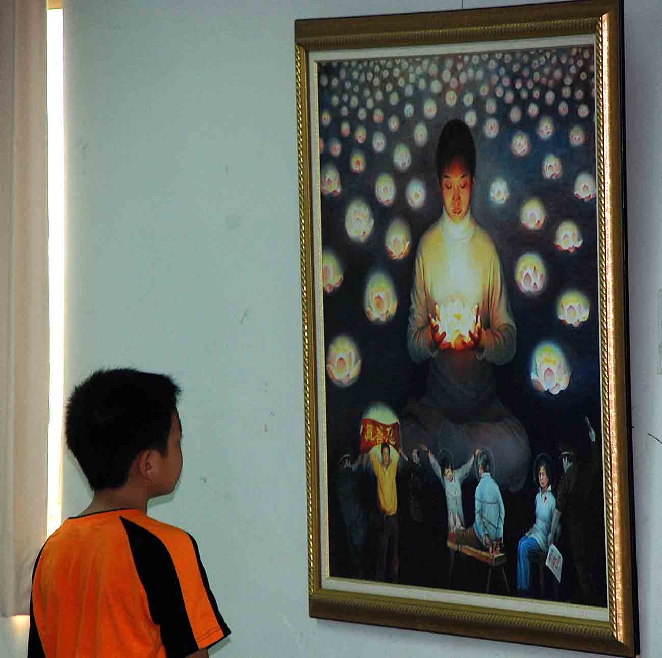 法轮功自一九九二年在中国大陆传出以后,因其教人修心向善,配合五套功法修炼,使人身心健康,几年之间修炼者达到一亿人,却由于中共与江氏集团的妒嫉心作祟,一九九九年开始对法轮功采取高压迫害手段。导览人员在一幅题为“打毒针”的画作前说明:“法轮功学员因为不放弃信仰而被关押在精神病院,被注射有害神经的药物,作品以一位年轻的女孩为主角,修炼的美好和迫害的邪恶形成很鲜明的对比,虽然她受到邪恶的迫害,但心中充满‘真、善、忍’的慈悲祥和境界,尽管身体受到折磨和残害,她的心灵是那么高贵,画家用分割式的手法表达善恶分明,她看着这束光,光明中的两个小婴孩,代表对她的赞美。”