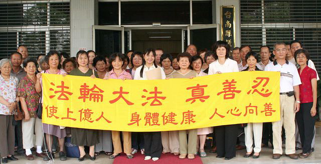 ![]() 谴责中共活摘器官暴行的临时提案表决通过后,曾王雅云议员(中间前长发者)与法轮功学员在台南县议会前合照 |