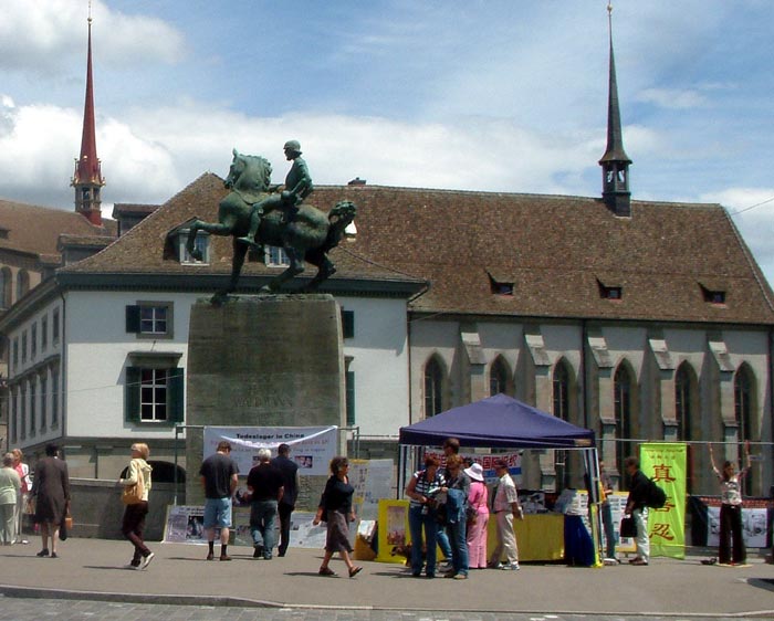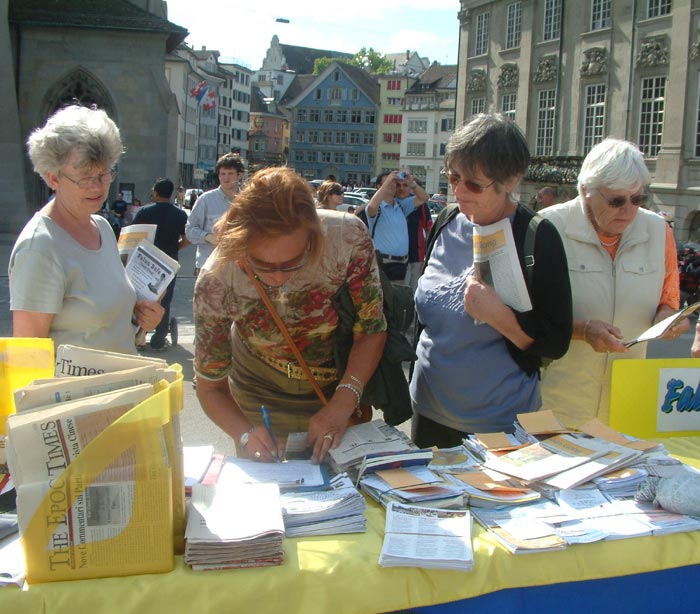 一位瑞士高中生和他的母亲在反迫害征签簿上签过名之后,来到学员面前说,请多给我些材料,我要放到我们学校的图书馆里,让学校的师生和更多的人员知道中共这种惨无人道的罪行,共同发出立即制止迫害的呼声!惩罚那些犯罪者。
