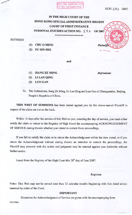 ![]() 香港高等法院的诉讼书 |