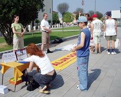法轮功学员们的活动很快吸引路人的眼光,他们饶有趣味的看着学员们演示五套功法,并且阅读学员所分送的信息材料。有许多人在看完描述法轮功在中国所遭受迫害的真相资料和图片后,立即在呼吁制止迫害的请愿文件上签名并且询问如何对受迫害者提供协助。