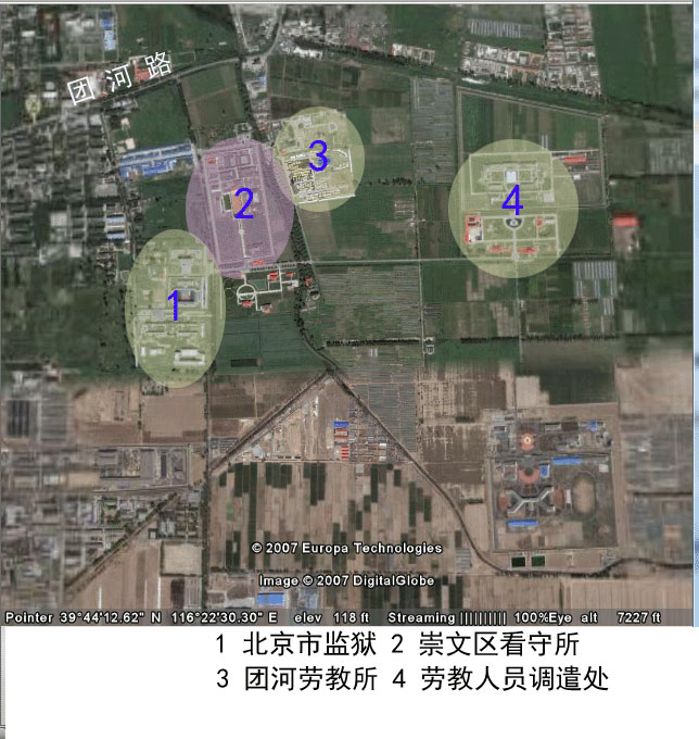 感兴趣的朋友可以用GOOGLE EARTH搜一下,从GOOGLE EARTH上查看这些监狱、劳教所等处,还是比较好找的,尤其是新建的,大多有一个方形或长方形围合的监区,细看可以看到高墙,这个区域建筑集中,面积大。监区外有自由布置的管理区,这个区域建筑物较少。