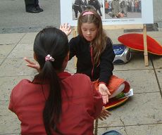 一位才五、六岁的小姑娘,当看到学员在演示功法时,立即摆脱妈妈的手,主动跑到学员面前跟着学起来,尽管不远处有热闹的杂耍表演,她竟然不为所动,一直静静的跟着炼完五套功法。她的妈妈也一直静静的在旁边陪伴着女儿,并用自己的手机将女儿炼功的情景拍摄下来。当得知现在每周四当地都有炼功活动时,她表示届时将会带女儿前去。