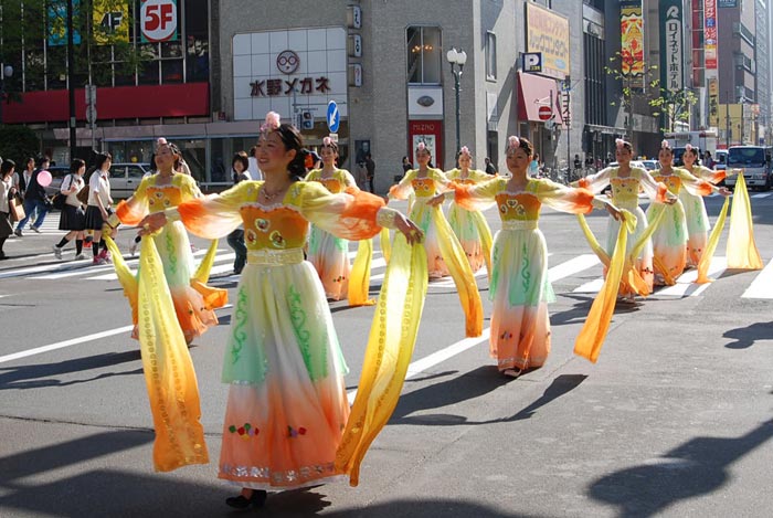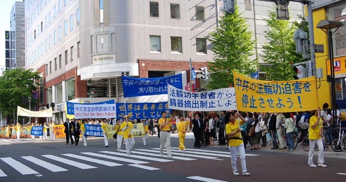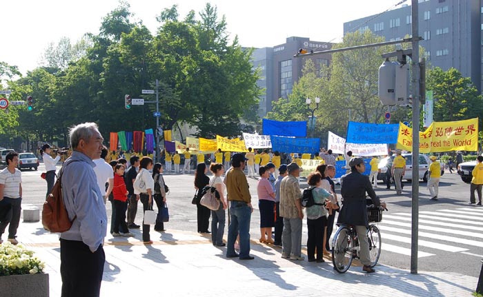 上午11点50分开始学员们聚集在大通公园集体炼功、洪法。中午一点十五分,集会开始。法轮功学员、大学副教授星野先生在发言中指出有一位学员因修炼法轮功而被中共驻札幌领事馆向学校施压,在硕士升学考试中校方不予颁发准考证(相当于取消考试合格),使她失去在札幌学习的权利。这是中共迫害法轮功延伸到海外的又一例证。