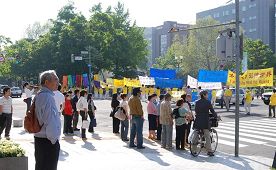 一位老年妇人幼年曾经在中国沈阳生活过十年,她看到游行队伍连声赞叹:“太好了,非常好。”并激动的用中文和法轮功学员打招呼,听到学员讲述受迫害的真相时她感到十分难过。