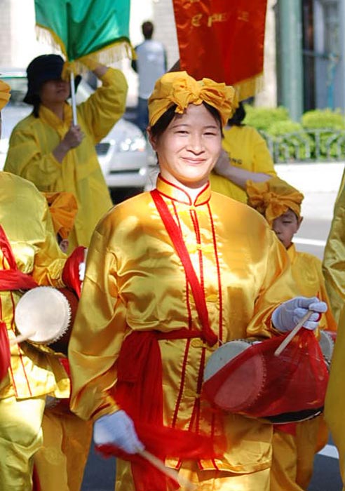 集会结束后,举行了从市中心的大通公园开始环绕繁华市区的游行。游行队伍由“真、善、忍”花车引导,后面是英姿飒爽的腰鼓队,阵阵鼓声震撼着路人。随后是举着“法轮大法好”、“世界需要真、善、忍”、“中共停止虐杀法轮功学员”、“中共邪灵的根都拔出来了”等横幅的队列。许多路人非常认真的阅读着横幅的内容,随之露出惊讶的面容,他们也许是第一次看到这样的游行。人们一边看着学员们派发的真相资料,一边看着横幅,表示极大的关注。在游行最后,翩翩起舞的仙女队列引来路人拿起手中的相机,纷纷摄下美好的瞬间。