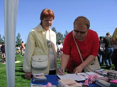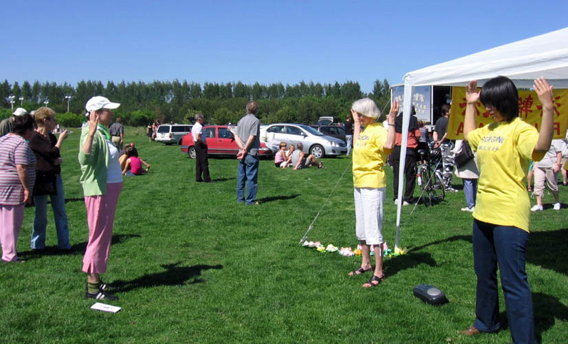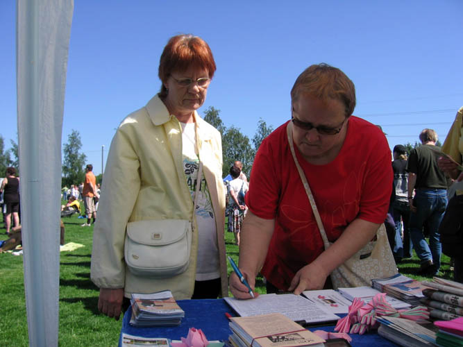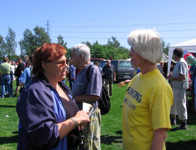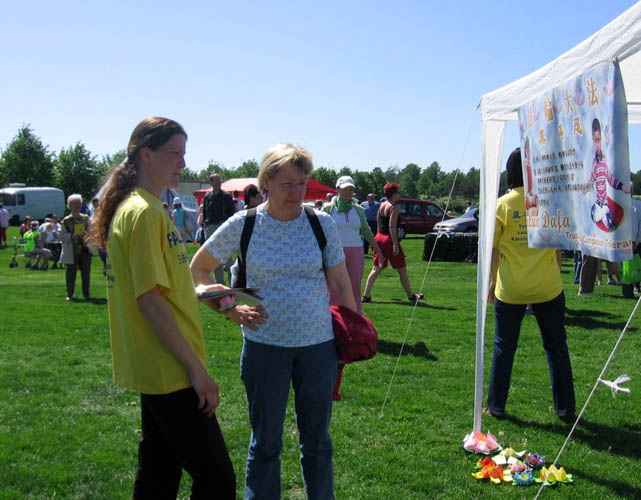 当天阳光灿烂,短暂的春天似乎已悄然离去,大多数人已着夏装。这里独特的一景是,许多人一边与他人分享着在芬兰难得一见的热闹场面,一边在玛堤斯河两岸挥杆垂钓,动中取静,陶醉于自身的爱好。而更多的人或坐在临时搭建的舞台前看表演,或品尝小吃、购买工艺品,或广泛涉猎,寻找所好。只见许多人好似被醒目的“法轮大法”横幅、祥和的法轮功炼功音乐和桌上、地下摆放的美丽的莲花引领到法轮功的展台前,接受学员递上的洪法传单、静观学员演示功法甚至跟着学折莲花、了解法轮功被中共迫害的真相,而后签名声援反迫害。