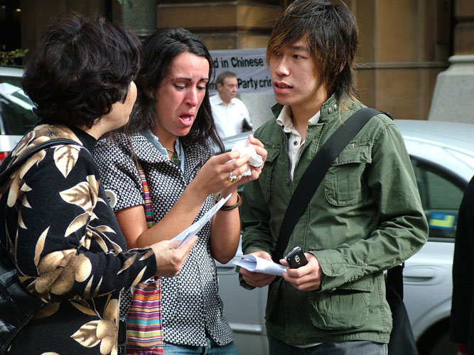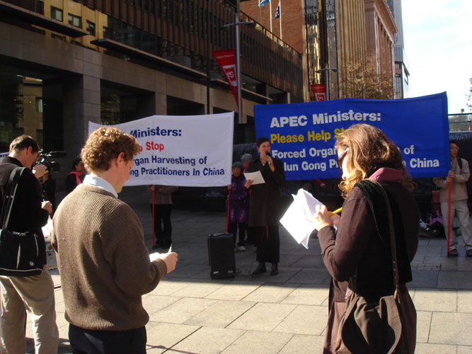 ![]() APEC部长会议期间法轮功学员举行新闻发布会,图为学员在向澳洲民众讲真相 |