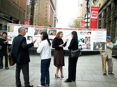 从本周一开始,部份悉尼法轮功学员就一直在会场附近的市中心Martin Place地区举横幅、发资料和为制止活摘器官的呼吁信征集签名,很多过往的行人不禁驻足阅读真相横幅和酷刑图片,索要真相资料,更有很多民众主动过来要求在呼吁信上签字表示支持,并询问还能提供怎样的帮助。常常一天就派发出去几千份真相资料,其中周三一天就派发了近八千份真相传单。