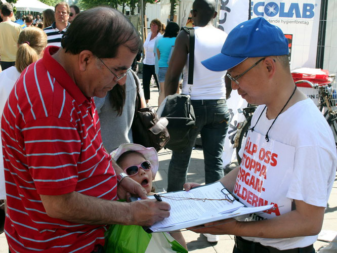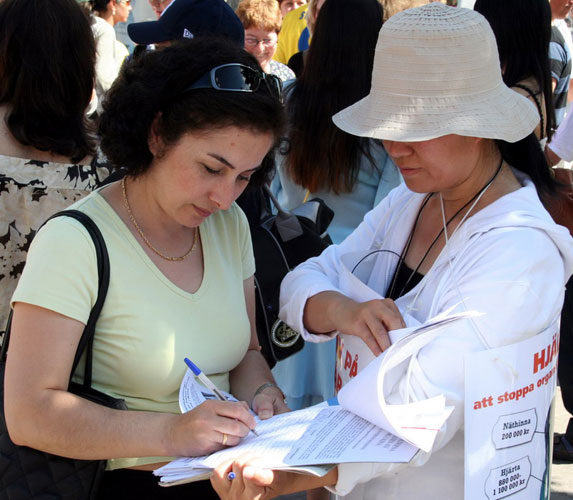 当天的游人中,还来了不少的中国人,他们大多都接了真相资料和《·九·评*共产党》,表示要珍惜能出来的这次机会,回去一定要好好的看看,这在国内是不敢看的。有位文静的女士表示不能相信竟会有活摘器官这样的事发生,法轮功学员做了些介绍并准备了一些中文资料给她看。人群中走过来一对老夫妇,他们已经在瑞典居住二十多年了,他们说,对中共我们太了解它(的邪恶本质)了。为了表示对中共的强烈谴责,二位老人签上了他们的名字。有一个移民来自中国的中学生也签了名还高兴的拿了中文资料说要回去给爸爸妈妈看。