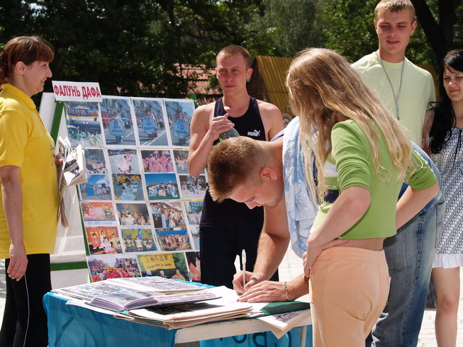 很多年轻人围过来了解真相,当他们得知学员在这里为谴责迫害而征集签名时,他们立即表示要签名。得知中共迫害有信仰的法轮功学员时,他们纷纷谴责中共的兽行并支持乌克兰法轮功学员的正义之举。