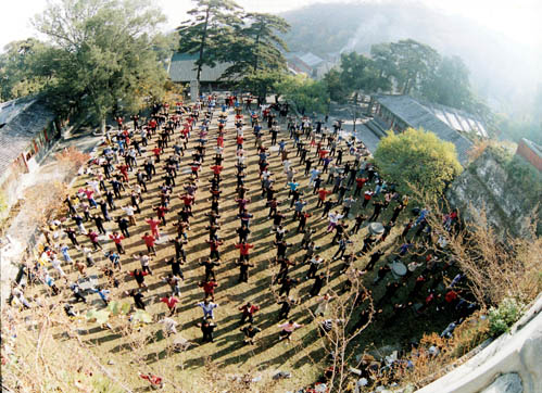 ![]() 古寺炼功 --- 参加一九九六年北京国际法会的各国法轮功学员在戒台寺晨炼 |