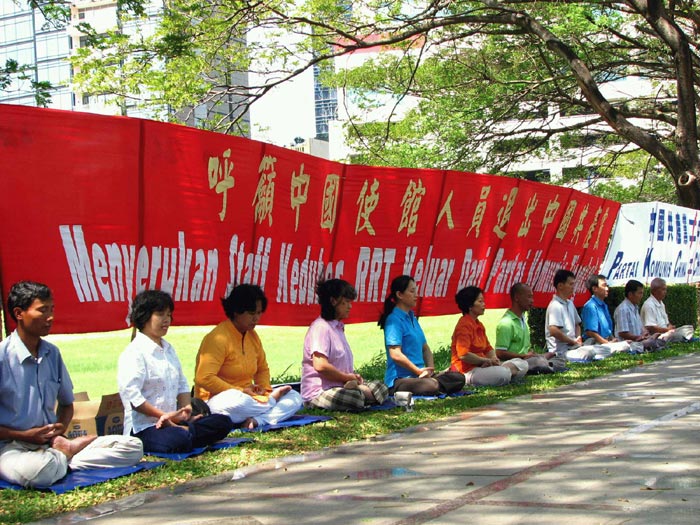 学员们在中使馆前拉开横幅,打坐炼功,分发资料,声援超过二千三百万中国民众的觉醒,共同唾弃给中华民族带来无数灾难的共产党。