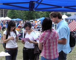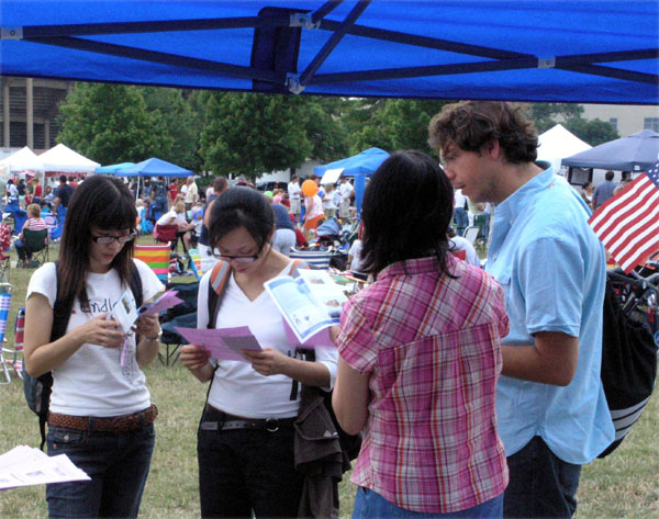 两位从台湾刚刚抵达德拉华学语言的女学生接过法轮功学员的资料,其中一位边看边问:“这个是不是在中国大陆遭到迫害的那个功法?迫害还在进行吗?”学员向她们介绍了法轮功以及在中国大陆法轮功学员被迫害的现状,她们对法轮功学员遭受迫害深表同情,并说:“共产党真的很坏,在台湾就不会发生这种事情。”与她们同行的一位西人男士则表示很想学炼法轮功,并急切的询问从这儿到达炼功点的路线。