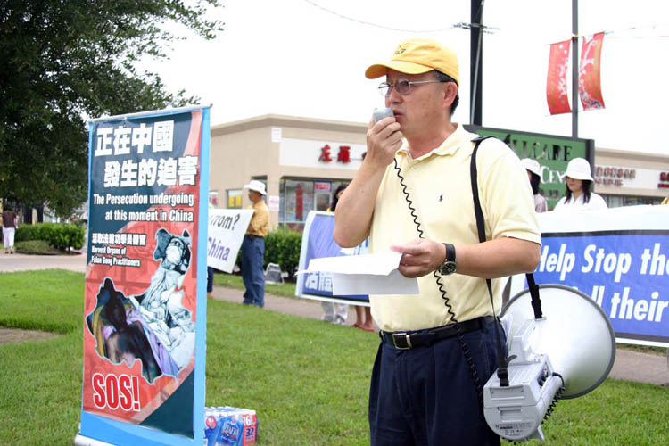 在休士顿的集会上,黄先生首先发言:“在中共对法轮功八年的残酷迫害下,修炼‘真、善、忍’的法轮功学员选择和平抗争的方式,讲清真相,戳穿中共的谎言。然而,由于一些人受了中共党文化的影响,被中共的谎言蒙蔽,袖手旁观,甚至助纣为虐。法轮功学员走街串巷、有的冒着生命危险,一次又一次的传播真相,只为拯救无辜的人。”他还表示:“善恶有报是天理。那些受中共谎言欺骗的官员和警察迫害过法轮功学员,如不改过,必定受到法律的制裁,受到神的惩罚。出于至善,法轮功学员不停的劝善,讲真相,心无恨意。朋友们,面对法轮功被迫害,请问:您心中那良心的天平,是偏向何方?一方是集古今邪恶之大全的中共邪灵,另一方是大善的法轮功修炼者。您如果选择向善,就能走向光明美好的未来。回顾古今中外的历史,暴政永远不长久,其实,中共的败亡已天象大显,《·九·评*共产党》一书问世以来,短短三年之中,已经有两千三百万的中国民众认清中共的邪恶本质,退出共产党及相关组织的人,每天以三四万的人数在增长,中共的灭亡,指日可待。朋友们,把握好良心的天平,支持善良的法轮功学员,共同谴责暴力,制止迫害。”